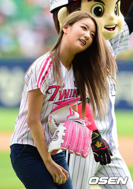 2일 오후 서울 잠실구장에서 열린 '2014 한국야쿠르트 세븐 프로야구' LG 트윈스와 넥센 히어로즈의 경기 시작전 에이핑크 윤보미가 시구를 마치고 그라운드를 걸어 나가고 있다.