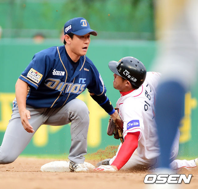 2일 오후 인천 문학야구장에서 열린 '2014 한국야쿠르트 세븐 프로야구' SK 와이번스와 NC 다이노스의 경기, 1회말 무사 1루에서 SK 이명기가 조동화 타석에 NC 이태원이 볼을 놓친 틈을 노려 2루 도루를 시도했지만 손시헌에 태그아웃당하고 있다.