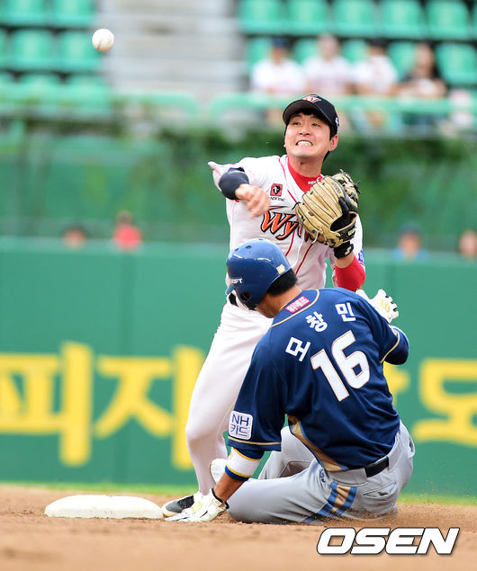 2일 오후 인천 문학야구장에서 열린 '2014 한국야쿠르트 세븐 프로야구' SK 와이번스와 NC 다이노스의 경기, 2회초 1사 1,2루에서 SK 김성현이 NC 손시헌의 1루 땅볼에 모창민을 포스아웃시키고 악송구를 범하며 실점을 허용하고 있다.