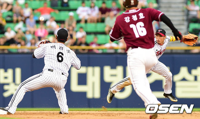 2일 오후 서울 잠실구장에서 열린 '2014 한국야쿠르트 세븐 프로야구' LG 트윈스와 넥센 히어로즈의 경기 4회초 1사 1루 김민성의 병살타를 잡은 황목치승이 박경수에게 송구하고 있다.