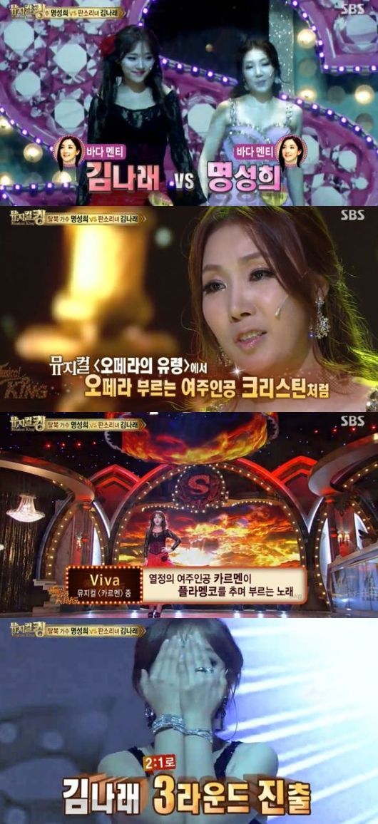 이날 '뮤지컬킹'의 두번째 라운드에 등장한 명성희와 김나래는 각각 '오페라의 유령'의 '씽크오브미(Think of me)', 를 '카르멘'의 '비바'를 선곡했다. 바다 팀 두 미녀의 대결에 많은 이들의 이목이 집중됐다. 임태경은 "장점을 얼마나 살리는 게 이번 라운드의 관전 포인트"라고 말하기도 했다.