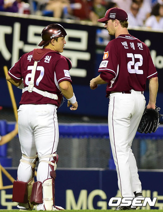 2일 오후 서울 잠실구장에서 열린 '2014 한국야쿠르트 세븐 프로야구' LG 트윈스와 넥센 히어로즈의 경기 8회말까지 무실점으로 마친 밴헤켄이 덕아웃으로 향하며 박동원과 이야기를 나누고 있다.