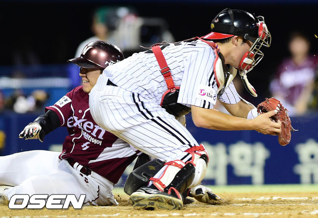 2일 오후 서울 잠실구장에서 열린 '2014 한국야쿠르트 세븐 프로야구' LG 트윈스와 넥센 히어로즈의 경기 9회초 1사 2,3루 서건창의 1루수 앞 땅볼 상황, 3루주자 문우람이 홈으로 쇄도하고 있다. 문우람은 홈에서 아웃.