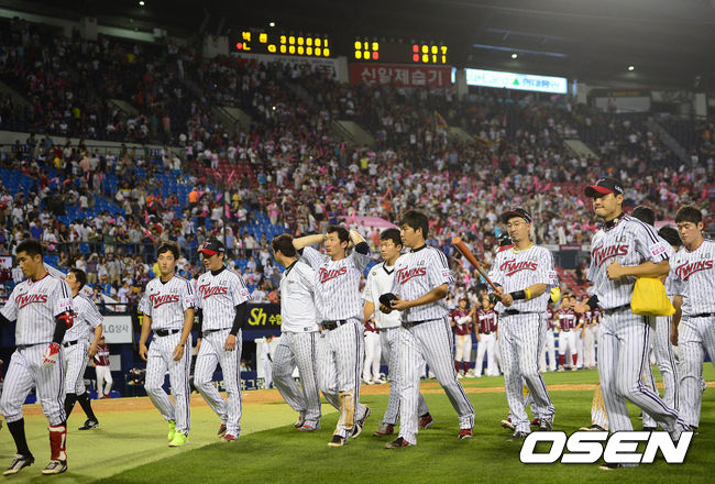 2일 오후 서울 잠실구장에서 열린 '2014 한국야쿠르트 세븐 프로야구' LG 트윈스와 넥센 히어로즈의 경기 종료 후 LG 선수들이 팬들에게 인사 후 그라운드를 퇴장하고 있다.