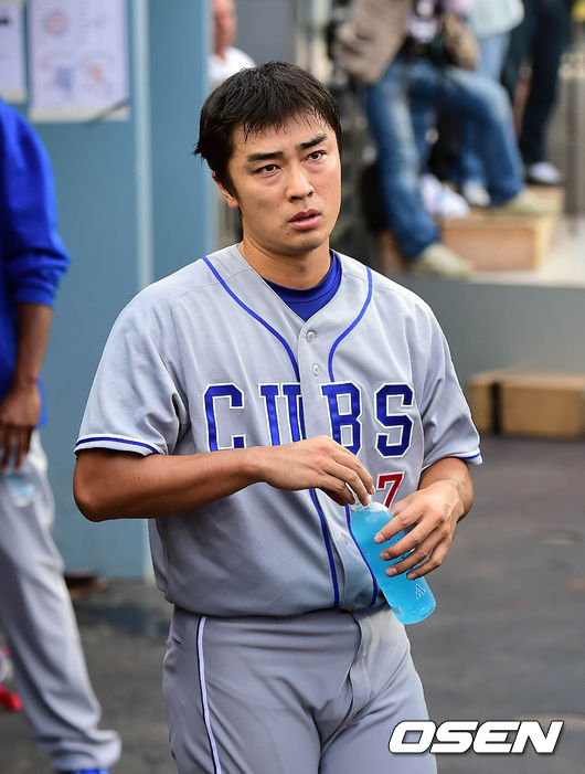 3일(한국시간) 미국 캘리포니아주 로스앤젤레스 다저스타디움에서 열린 '2014 메이저리그' LA 다저스와 시카고 컵스의 경기, 2회초 2사 1루 와다가 류현진에게 삼진으로 물러난 후 음료를 마시고 있다.