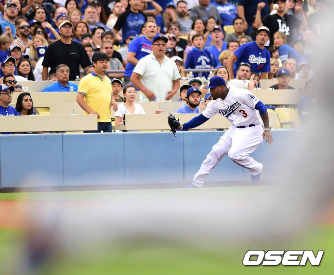 3일(한국시간) 미국 캘리포니아주 로스앤젤레스 다저스타디움에서 열린 '2014 메이저리그' LA 다저스와 시카고 컵스의 경기, 2회초 2사 1루 와다의 파울타구를 크로포드가 놓치고 있다.