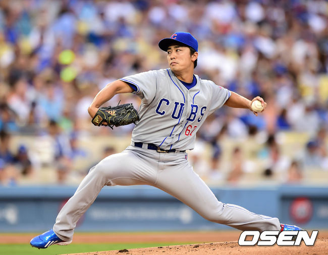 3일(한국시간) 미국 캘리포니아주 로스앤젤레스 다저스타디움에서 열린 '2014 메이저리그' LA 다저스와 시카고 컵스의 경기, 2회말 수비서 와다 츠요시가 체인지업을 던지고 있다.