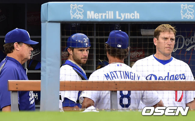 3일(한국시간) 미국 캘리포니아주 로스앤젤레스 다저스타디움에서 열린 '2014 메이저리그' LA 다저스와 시카고 컵스의 경기, 매팅리 감독이 부테라와 류현진 공 상태에 대해 이야기를 나누고 있다.