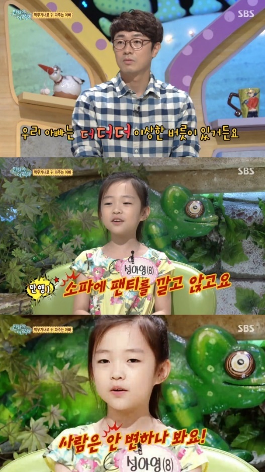 성아영은 "아빠가 옷을 안 입고 집을 돌아다닌다. 쇼파에 앉을 때는 팬티를 깔고 앉는다. 잘 때는 침대에 누워 팬티를 덮고 잔다"고 말해 모두를 놀라게 했다.