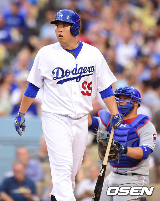 3일(한국시간) 미국 캘리포니아주 로스앤젤레스 다저스타디움에서 열린 '2014 메이저리그' LA 다저스와 시카고 컵스의 경기, 3회말 선두타자로 나선 류현진이 와다 츠요시에게 삼진을 당하고 더그아웃으로 가고 있다.