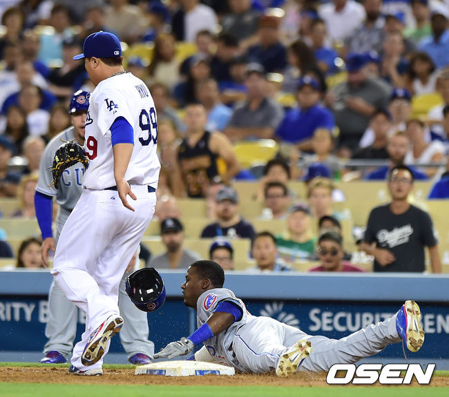 3일(한국시간) 미국 캘리포니아주 로스앤젤레스 다저스타디움에서 열린 '2014 메이저리그' LA 다저스와 시카고 컵스의 경기, 7회초 1사 레이크가 세이프티 번트를 시도 세이프 되고 있다.