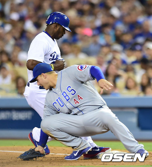 3일(한국시간) 미국 캘리포니아주 로스앤젤레스 다저스타디움에서 열린 '2014 메이저리그' LA 다저스와 시카고 컵스의 경기, 7회말 무사 중전안타로 진루한 푸이그가 렌테리아 감독의 비디오 판독 요청에 1루 견제사가 됐다.