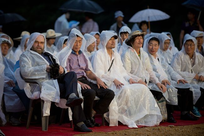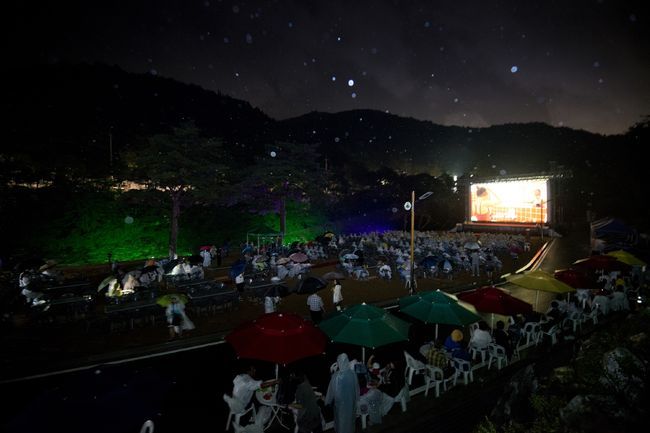 폭우도 관객들과 준비단의 열정까진 막지 못했다. 야외스크린에 불이 들어오자 사람들이 하나둘 자리를 채웠다. 막걸리를 사들고 일찌감치 자리를 잡은 중년 부부, 노란 우비를 입고 엄마의 손을 잡은 꼬마, 등산복 차림에 스틱을 들고 상영관을 찾은 등산객 등 관객들은 각양각색이었다. 파라솔 아래에서 비를 피하던 사람들도 준비단 측이 나눠준 흰 우비를 입고 지붕이 없는 야외 객석에 자리했다.