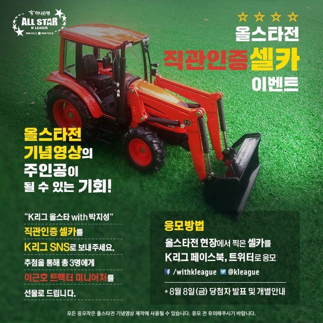 '하나은행 K리그 올스타 with 팀 박지성' 직관 인증 셀카 이벤트는 오는 6일(수) 자정까지 K리그 공식 페이스북(www.facebook.com/withKLEAGUE)및 트위터(@kleague)를 통해 진행된다. K리그 올스타전에서 촬영한 셀카 혹은 자신의 모습이 함께 촬영된 현장 사진을 댓글이나 쪽지를 통해 전송하면 응모가 완료된다. 응모된 사진은 '하나은행 K리그 올스타 with 팀 박지성' 후속 영상 제작에 활용될 계획이며, 이 중 가장 개성있는 사진을 남겨준 팬 3명에게는 이근호 선수가 운전했던 트랙터 미니어처도 경품으로 증정할 예정이다.
