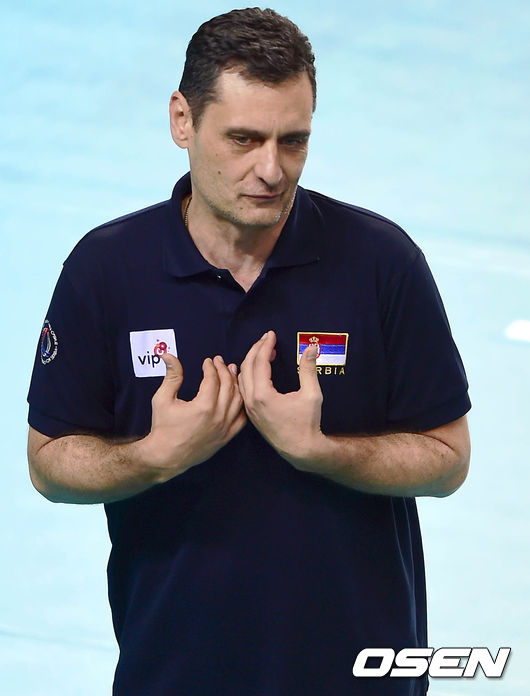 3일 오후 경기도 화성실내체육관에서 열린 '2014 그랑프리 세계여자배구대회' 대한민국과 세르비아의 경기, 2세트 세르비아 테르지치 조란 감독이 옐로카드를 받고 어필하고 있다.
