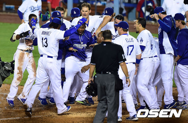 연장 12회말 2사 1,2루 다저스 라미레즈가 끝내기 홈런을 때린 뒤 동료들과 기뻐하고 있다./youngrae@osen.co.kr