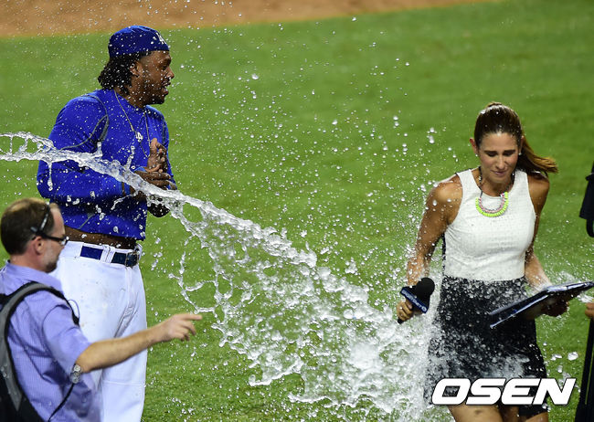 다저스 곤잘레스가 끝내기 홈런을 때린 라미레즈와 인터뷰를 하던 아나운서에게 물을 뿌리고 있다./youngrae@osen.co.kr