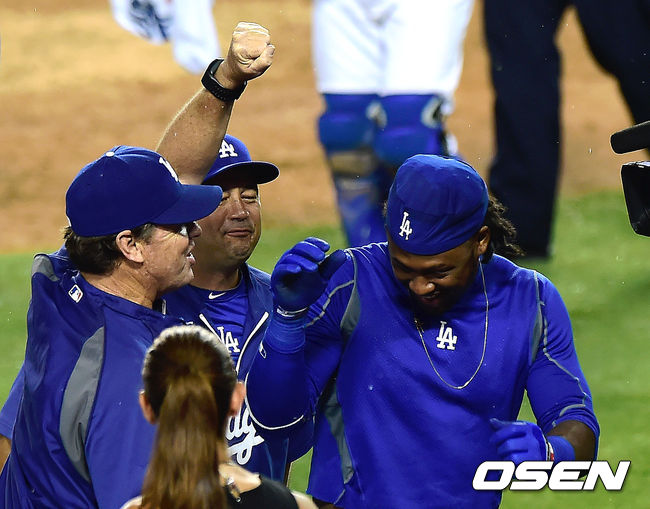 연장 12회말 2사 1,2루 다저스 라미레즈가 끝내기 홈런을 때린 뒤 허니컷 코치와 기뻐하고 있다./youngrae@osen.co.kr