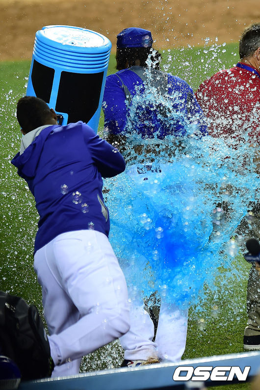 다저스 푸이그가 끝내기 홈런을 때린 라미레즈에게 물을 뿌리고 있다./youngrae@osen.co.kr