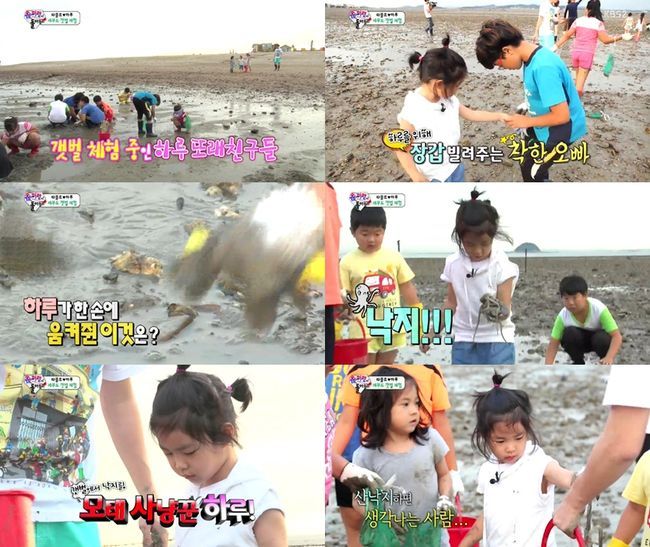 이날 타블로와 하루는 장갑과 장화를 낀 채 쏙과 게를 잡는데 열중했다. 그간 거침없이 동물들을 만지며 겁없는 모습을 보였던 하루는 의외로 갯벌 생물을 무서워 하며 "아빠가 잡아줘"라고 몸을 사렸다.