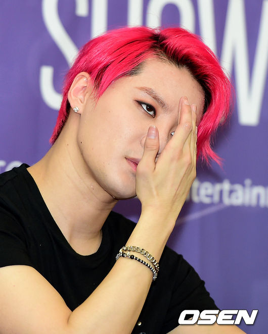JYJ 준수가 간담회 도중 땀을 닦고 있다.