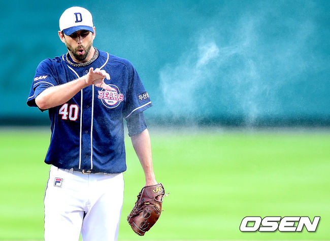 `회말 한화 공격 때 두산 선발 니퍼트가 투구를 준비하며 로진을 불고 있다.