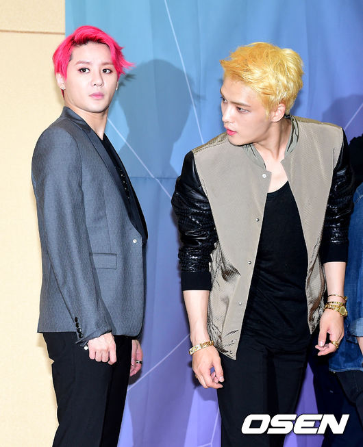 JYJ 준수, 재중이 간담회를 마치고 포토타임을 준비하고 있다.