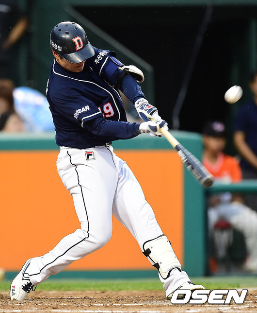 3회초 두산 공격 1사 3루 상황 민병헌이 동점 1타점 우익수 희생플라이를 날리고 있다.