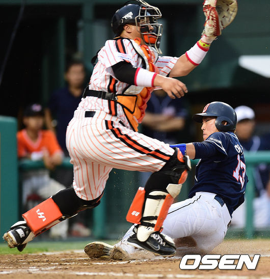 3회초 두산 공격 1사 3루 상황 민병헌의동점 1타점 우익수 희생플라이 때 3루 주자 허경민이 홈으로 태그업해 한화 포수 조인성의 태그를 피해 세이프되고 있다.