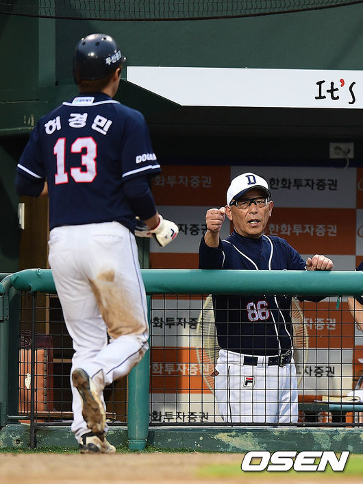 3회초 두산 공격 1사 3루 상황 민병헌의 동점 1타점 우익수 희생플라이 때 3루 주자 허경민이 홈으로 태그업 해 세이프된 뒤 송일수 감독과 인사를 나누고 있다.