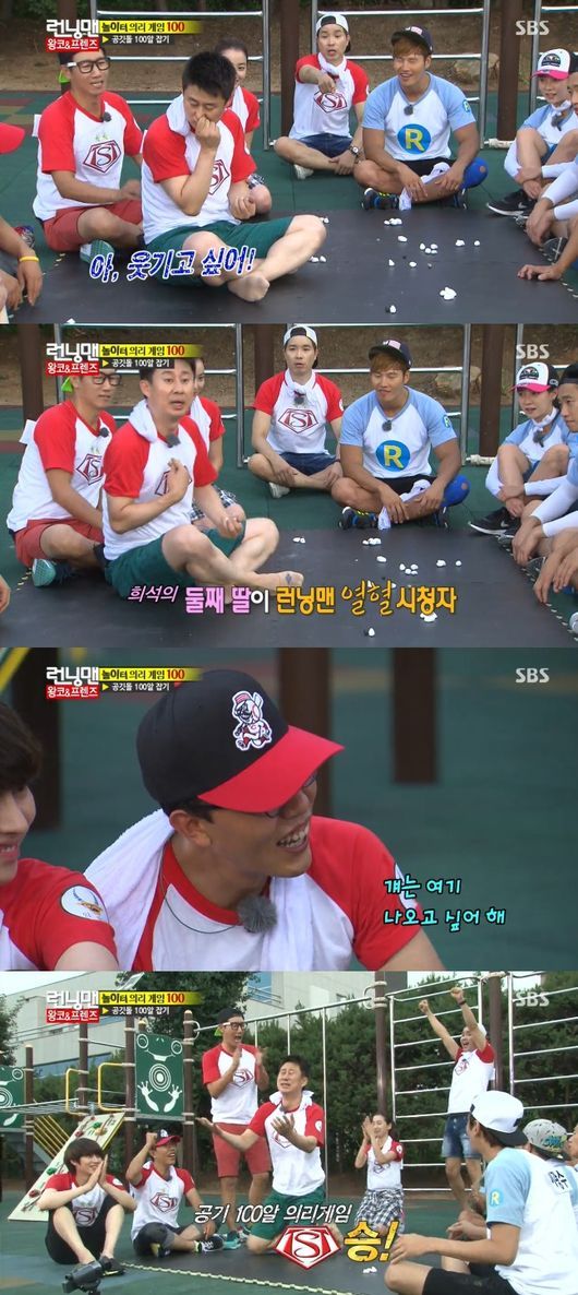 이날 세 번째로 '놀이터 의리 게임 100'이 진행됐다. 공깃돌 100알 잡기 게임에서는 박수홍과 남희석의 활약으로 앞서 두 게임에서 모두 진 것에 이어 처음으로 '런닝맨' 팀을 제쳤다.