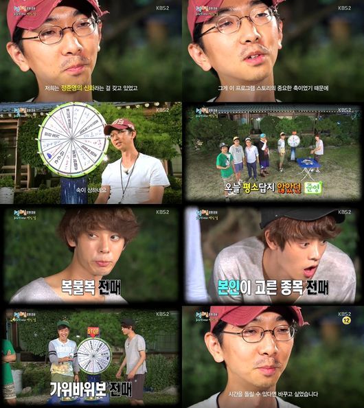 정준영의 대결 신청을 받아들인 다섯 형들은 팀별로 가장 자신 있는 게임 종목을 써넣은 돌림판을 돌려 나온 종목으로 5판 3선승제의 게임을 진행했다. 첫 번째 게임 종목은 '수박씨 얼굴에 올리기'로 김주혁을 상대로 정준영은 쉽게 게임을 이겼다. 두 번째 경기는 '초밥 복불복'으로 2개의 초밥 중 고추냉이가 잔뜩 들어간 초밥을 먹고 반응을 보이면 지는 게임이었다. 이에 김종민은 정상적인 초밥을 택했지만, 정준영은 고추냉이 초밥을 택해 게임 승리의 난관에 부딪쳤다.