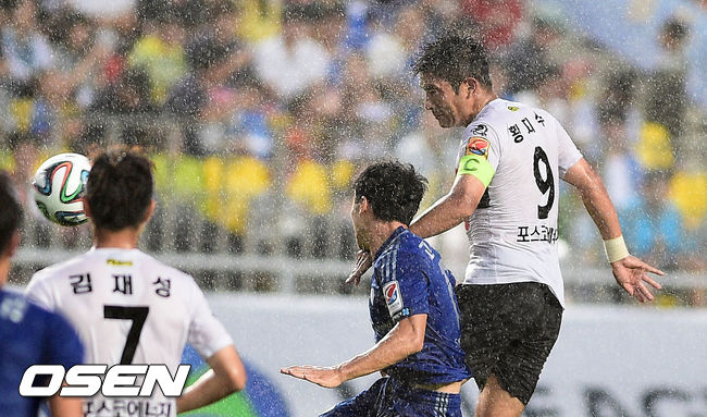 3일 수원월드컵경기장에서 열린 현대오일뱅크 K리그 클래식 2014 수원 삼성과 포항 스틸러스의 경기,전반 포항 황지수가 헤딩슛을 시도하고 있다.