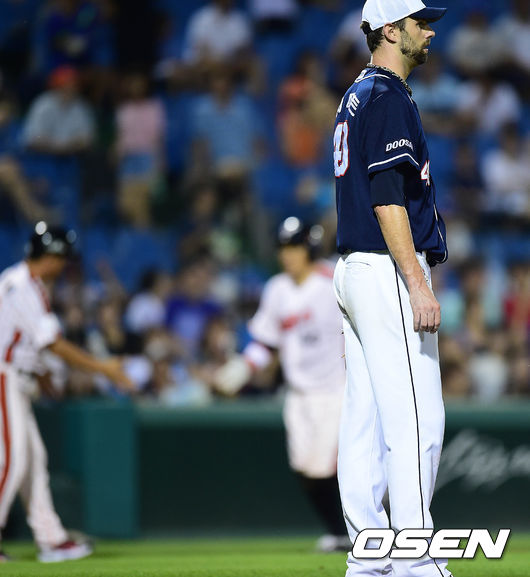 6회말 한화 공격 2사 1, 2루 상황 조인성에게 중월 스리런포를 허용한 두산 선발 니퍼트가 아쉬워하고 있다. 이후 두산이 홈런에 대해 합의 판정을 요청했으나 원래 판정 그대로 홈런으로 인정.