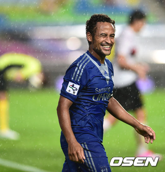 3일 수원월드컵경기장에서 열린 현대오일뱅크 K리그 클래식 2014 수원 삼성과 포항 스틸러스의 경기,후반 수원 산토스가 추가골을 넣고 환호하고 있다.
