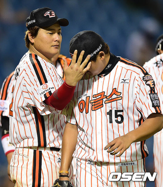 8회초 두산 공격 1사 2루 상황 한화 선발 유창식이 마운드를 내려오며 팀 선배 김태균에게 격려를 받고 있다.