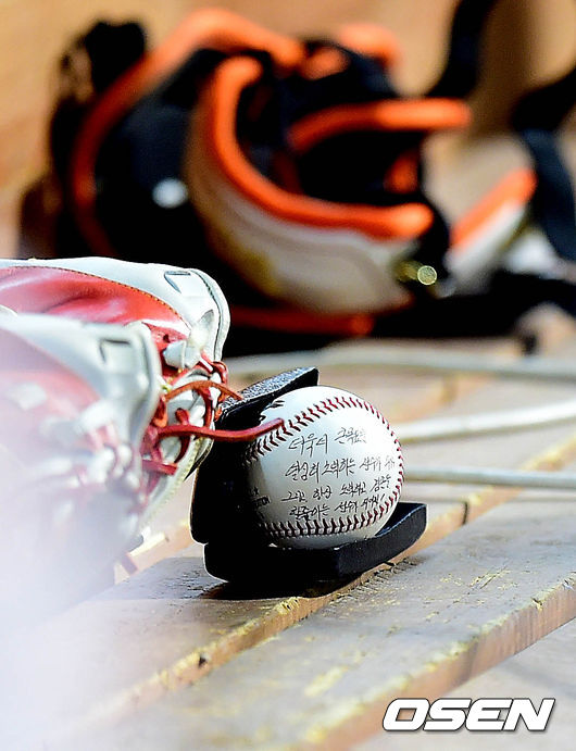 8회초 두산 공격이 진행되고 있는 가운데 한화 벤치에 이종범 코치가 조인성에게 격려의 메시지를 적어놓은 스리런 홈런공이 놓여져 있다.