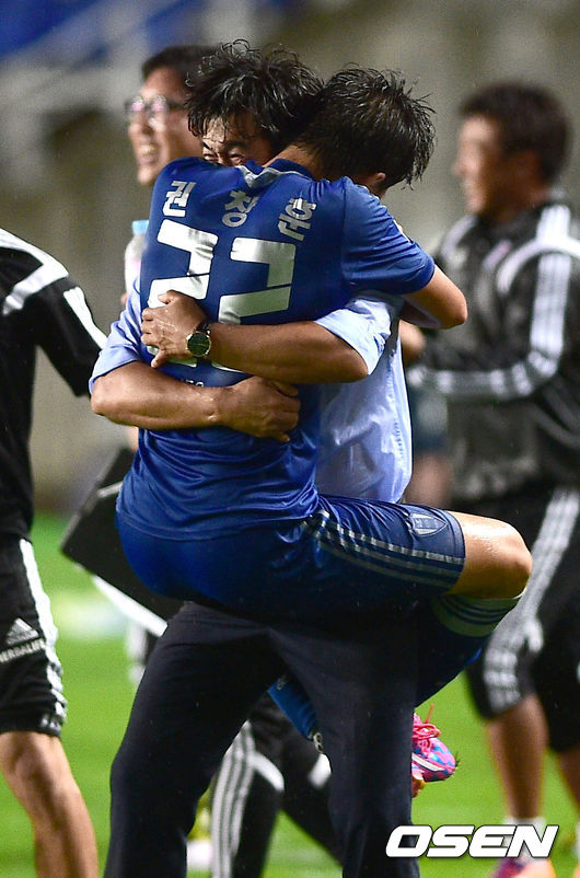 후반 수원 로저의 추가골때 어시스트를 기록한 권창훈이 서정원 감독과 포옹을 하고 있다./ soul1014@osen.co.kr