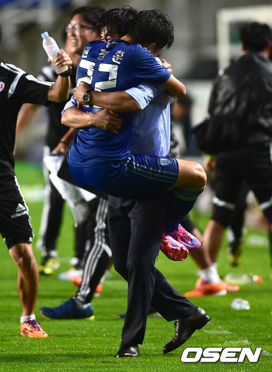 후반 수원 로저의 골때 어시스트를 기록한 권창훈이 서정원 감독과 포옹을 하고 있다./ soul1014@osen.co.kr