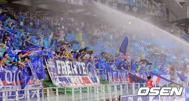 경기종료후 물대포에 수원 서포터즈가 즐거워하고 있다./ soul1014@osen.co.kr
