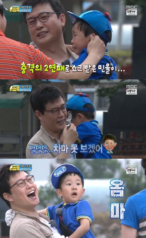 민율은 지난 3일 방송된 MBC 예능프로그램 '일밤-아빠어디가(이하 '아빠어디가')'에서 충격의 2연패를 당한 뒤 아빠 품에 안겨 눈물을 터뜨렸습니다.