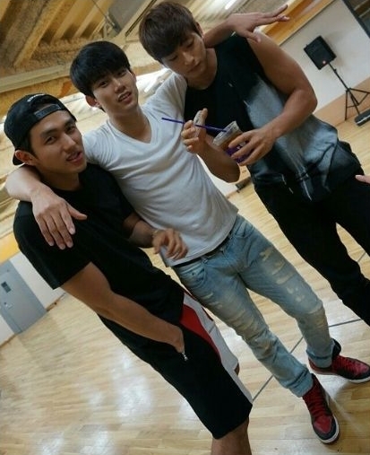 공개된 사진 속 세 사람은 나란히 서 있고, 옥택연은 두 사람에게 어깨동무를 하고 있다. 특히 무대 위와는 다른 수수한 차림으로 친근한 모습을 선보였다.