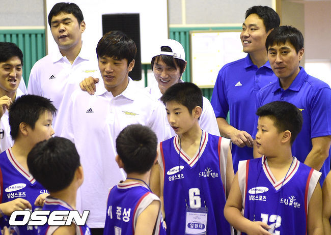 4일 오후 경기도 용인 삼성트레이닝센터에서 진행된 남자농구 삼성 썬더스-여자농구 삼성생명 블루밍스 재능기부 프로그램 '드림캠프'에서 삼성 이시준과 박재현이 유소년 선수들을 보며 미소 짓고 있다.