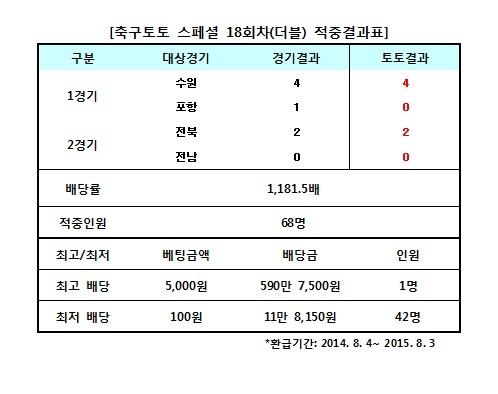 국민체육진흥공단(www.kspo.or.kr)이 발행하는 국민체육진흥투표권 수탁사업자인 스포츠토토(www.sportstoto.co.kr)는 지난 3일(일)에 벌어진 수원-포항(1경기), 전북-전남(2경기)의 K리그 클래식 2경기를 대상으로 한 축구토토 스페셜 18회차 더블 게임에서 2경기의 결과를 정확히 맞힌 참가자가 모두 68명이 나와 각각 베팅 금액의 1,181.5배에 해당하는 적중상금을 가져가게 됐다고 밝혔다.