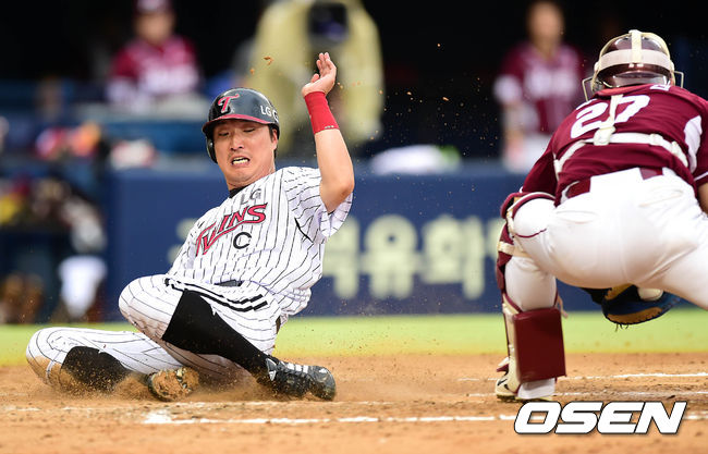 2회말 1사 만루에서 LG 박경수의 동점 희생플라이때 태그업을 시도한 3루주자 이진형이 홈에서 세이프되고 있다.