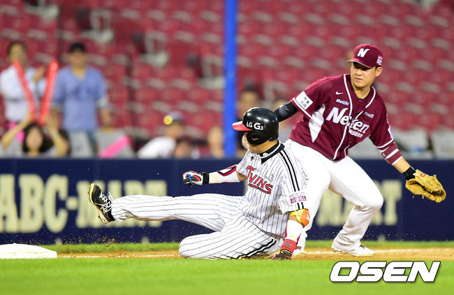3회말 2사에서 우전 안타를 친 LG 채은성이 3루로 쇄도하고 있다.