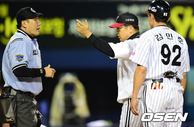 5회말 1사 2,3루에서 LG 양상문 감독이 채은성의 적시타때 홈으로 쇄도한 2루주자 이병규의 아웃 판정에 대해 문동균 구심에게 어필하고 있다.