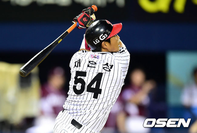 5회말 1사 2,3루에서 LG 채은성이 적시타를 치고 있다.