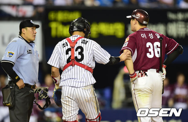 6회초 넥센 이성열이 문동균 구심의 삼진 판정에 어필하고 있다.