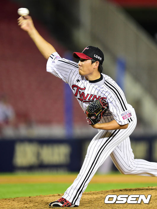 8회초 LG 정찬헌이 힘차게 공을 던지고 있다.